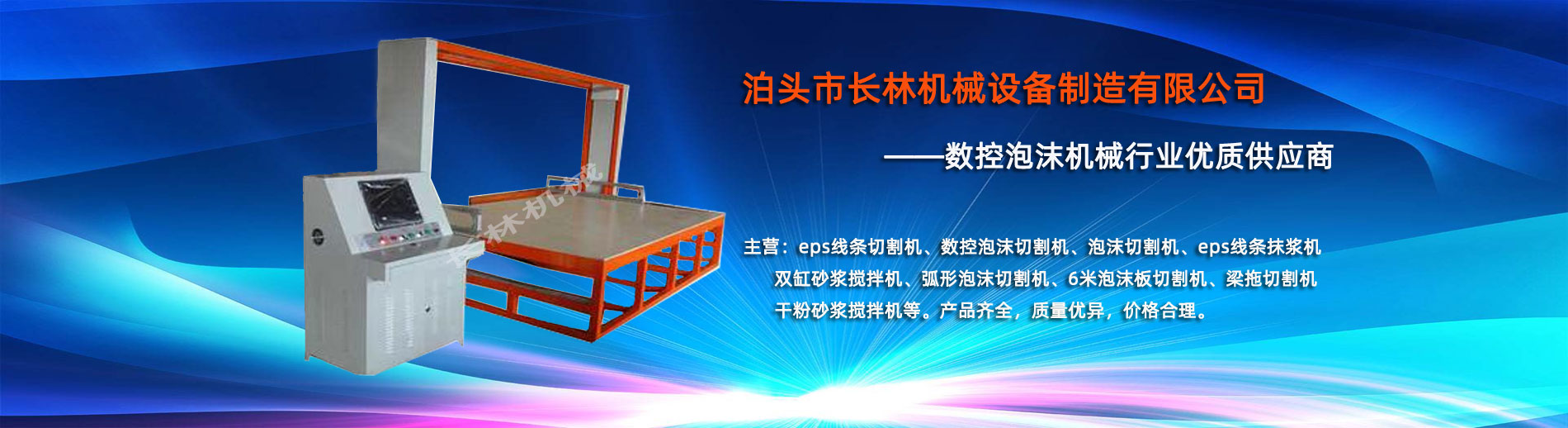 泊頭市長(zhǎng)林機(jī)械設(shè)(shè)備制造有限公司座落于河北省泊頭市開發(fā)(fā)區(qū)(qū),地處北京、天津、濟(jì)南、石家莊中心位置。京滬高速、京滬鐵路、106國道、104國道穿行于本市,交通便利。 本公司是集多功能數(shù)(shù)控泡沫切割機(jī)的自主研發(fā)(fā)、生產(chǎn)(chǎn)、銷售和服務(wù)(wù)于一體的企業(yè)(yè),eps線條設(shè)(shè)備,數(shù)(shù)控泡沫切割機(jī),發(fā)(fā)泡陶瓷切割機(jī),eps線條切割機(jī)銷往全國各地,并開辟了國際合作的廣闊渠道。創(chuàng)(chuàng)新不斷的長(zhǎng)林?jǐn)?shù)控機(jī)械有限公司經(jīng)(jīng)過幾年的不斷研究,完善了建筑裝飾構(gòu)(gòu)件的配套設(shè)(shè)備和自動(dòng)化設(shè)(shè)備,由過去手工生產(chǎn)(chǎn)到半自動(dòng)生產(chǎn)(chǎn)發(fā)(fā)展到現(xiàn)(xiàn)在的CNC控制的全自動(dòng)零誤差數(shù)(shù)控泡沫切割機(jī)床。不但讓客戶在交貨期上面爭(zhēng)取了時(shí)間而且···